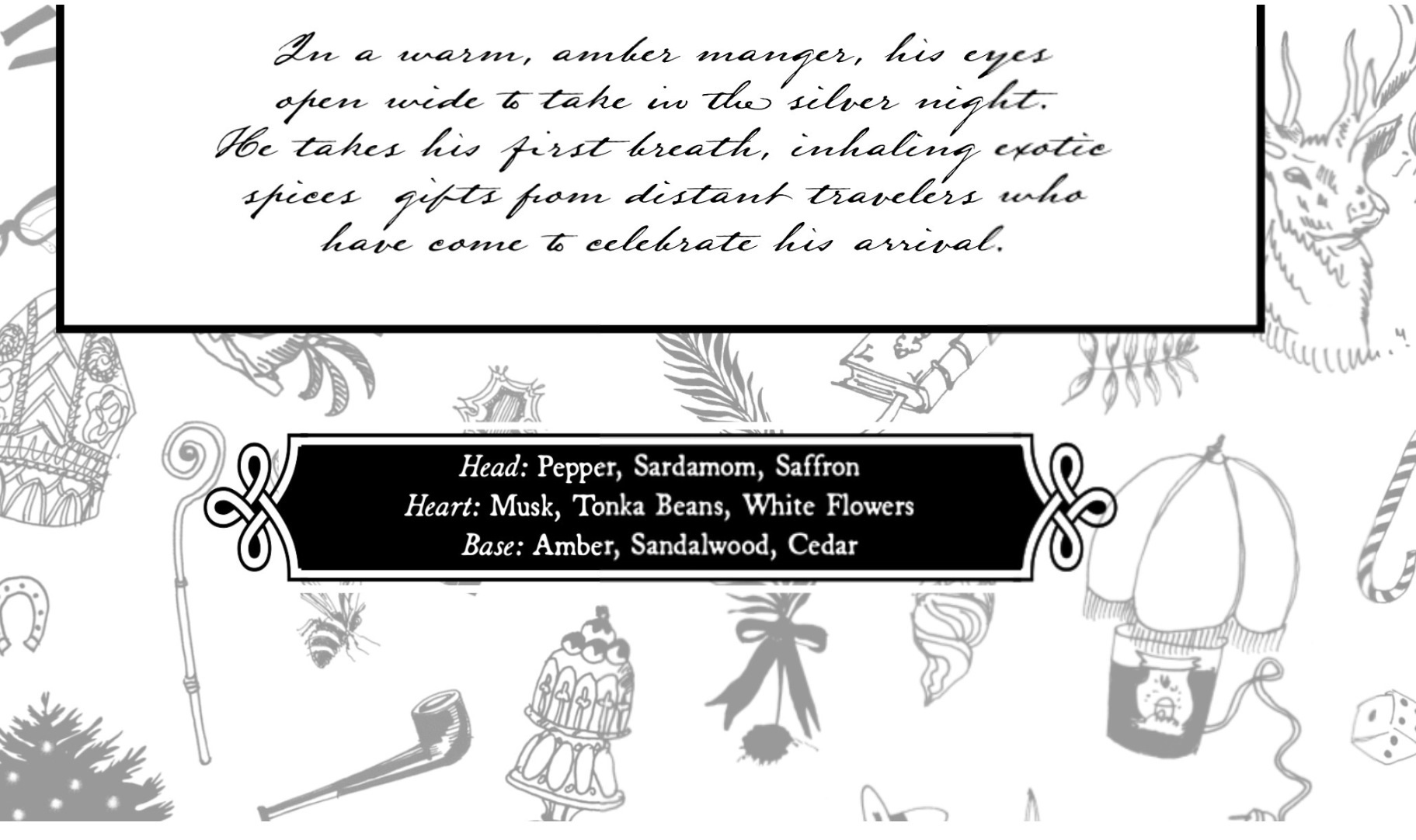 Bethléem, pictured above with the theme and notes, is the latest seasonal candle from Cire Trudon. You may need to zoom in to read the calligraphy.